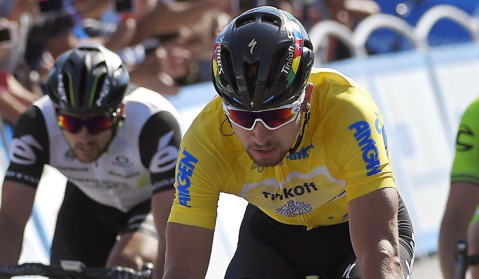 Peter Sagan, Tinkoff, zlty dres, cierna prilba, finish, Jun2016 Zdroj: SITA