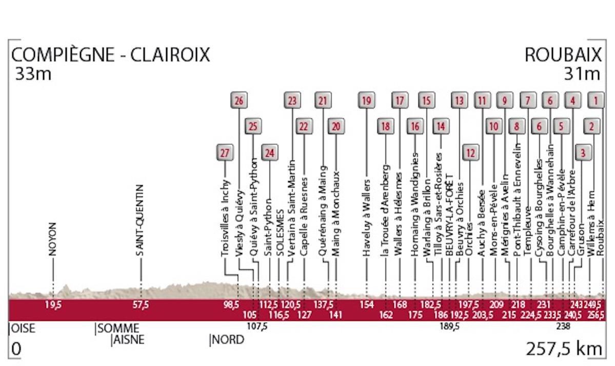 Pelotón odštartuje v nedeľu po 10:30 h z Paríža s 200 jazdcami a postupne prejde do 257,5 km vzdialeného velodrómu v Roubaix cez 27 úsekov s dlažobnými kockami. Nie nadarmo získali preteky prezývku "Peklo severu".