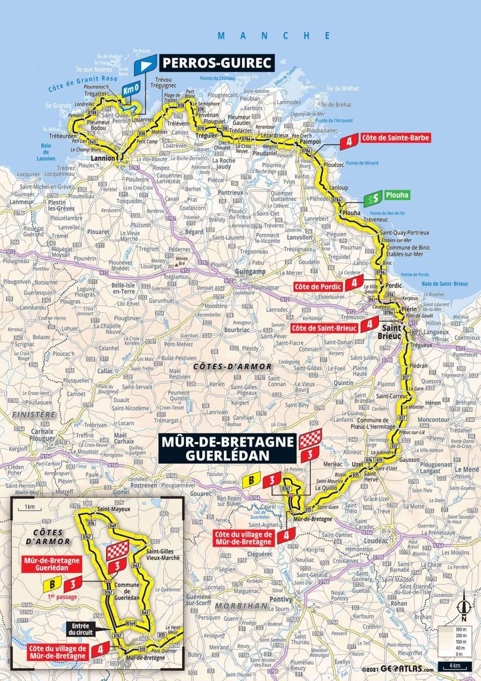 Po 103 kilometroch cyklistov preverí Côte de Pordic (2,1 kilometra; 3,2 %) a následne aj Côte de Saint-Brieuc (1 kilometer; 8 %), no v oboch prípadoch pôjde o stúpania zaradené do štvrtej kategórie, takže tá najťažšia skúška dňa ešte len príde. Cesta zavedie „balík” priamo k Mûr-de-Bretagne.