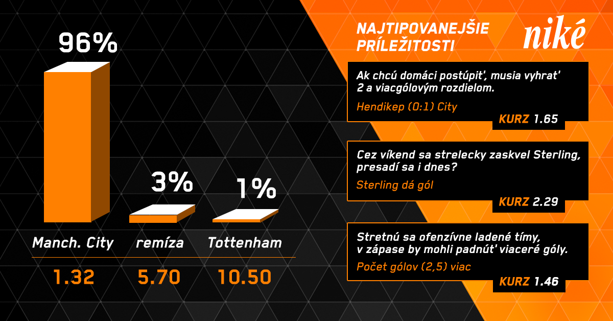 Na zverencov Pepa Guardiolu tak čaká úloha, ktorú v ostatných deviatich prípadoch nezvládol žiadny súper Tottenhamu. Spurs totiž v danom období nikdy nevypadli po tom, ako v prvom zápase dosiahli víťazný výsledok.