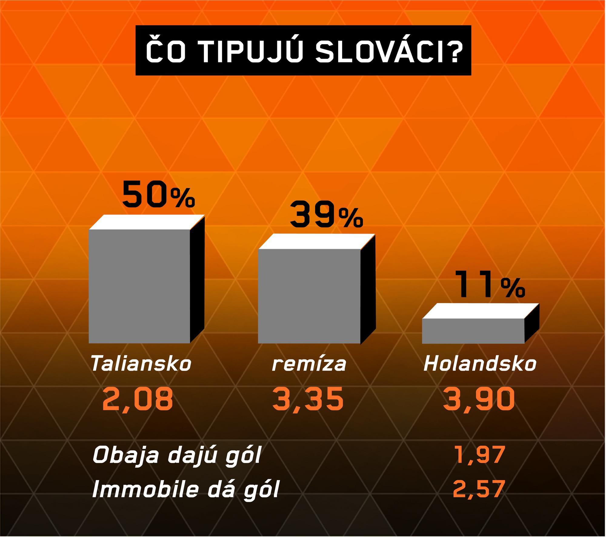 Holanďania majú na konte o bod menej, keď si poradili na úvod s Poliakmi (1:0) a v nedeľu remizovali s Bosnou bez gólov. Keďže vzadu majú jedného z najlepších obrancov sveta Virgila van Dijka, pri ktorom rastie Nathan Aké a zastupuje zraneného de Ligta, s defenzívou nie sú problémy. Horšie je to v útoku, kde musia ťahať hráči z poľa (napríklad Wijnaldum). Z posledných deviatich presných zásahov zaznamenali holandskí útočníci len jeden.