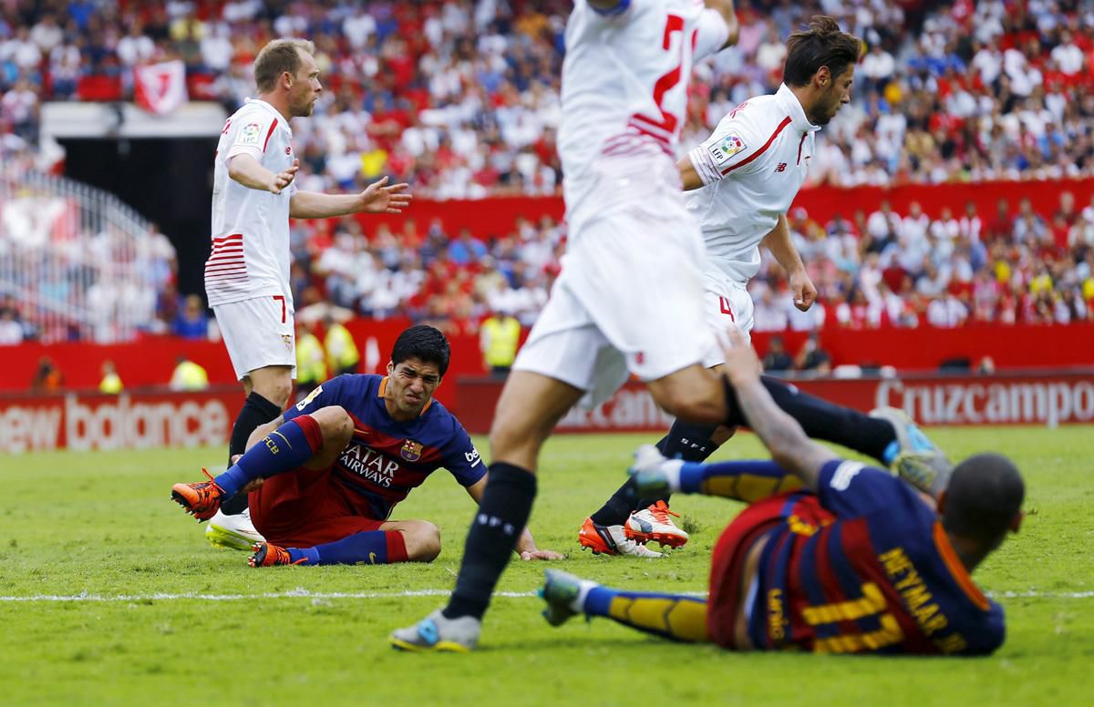 Barca síce nastúpila v metropole Andalúzie bez zranených opôr Lionela Messiho a Andreasa Iniestu, napriek tomu mala od úvodu viac z hry. V úvode mal veľké šance Luis Suarez, v 24. minúte Neymar vyvrátil všetky zákony fyziky, keď sa lopta po jeho priamom kope odrazila od žrde a kĺzala sa po celej bránkovej čiare von z brány.