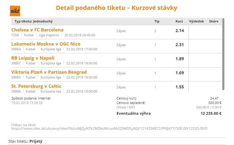 Päticu európskych pohárových súťaží si na svoj tiket vybral jeden z tipérov. Svoj výber si ohodnotil 500-eurovým vkladom. Ak vyjde, na jeho konto pribudne parádnych 12 235 €. Bude úspešný?