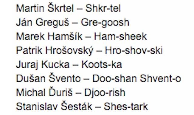 Túto úsmevnú pomôcku zverejnila oficiálna stránka Európskej futbalovej asociácie (UEFA). Čitateľom či žurnalistom podrobne vysvetľuje správny spôsob čítania mien všetkých futbalistov, našich nevynímajúc. Čiže podľa uefa.com je Marek Hamšík Mareck Ham-sheek a priezvisko Juraja Kucku sa zase číta Koots-ka.