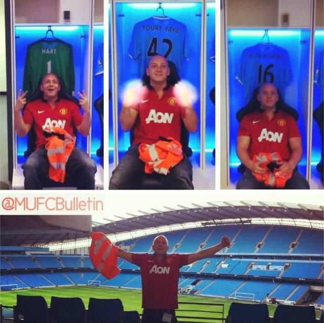 Rivalita medzi futbalovými klubmi vie byť veľakrát poriadne vyhrotená. Inak to nie je ani medzi fanúšikmi, veď rozbroje medzi fanklubmi sú pre bežného človeka, ktorý aspoň z časti sleduje tento šport, pomerne známe. V Anglicku sú najvyhrotenejšie vzťahy najmä medzi slávnymi mužstvami Manchester United a FC Liverpool, no v posledných rokoch sa na Ostrovoch dostalo na podobnú úroveň už aj manchesterské derby medzi spomínaným United a City. Veď majstrovský titul v Premier League bol v posledných dvoch ročníkoch výhradnou časťou anglického „mesta motorov“. Ale k veci. Istý priaznivec „červených diablov“ využil svoje kontakty, vďaka ktorým sa dostal priamo do jamy levovej, teda na Etihad Stadium. Počkal si na najvhodnejší moment a postaral so o fotografie, ktoré následne preleteli internetom. Z tábora „vlastných“ sa mu dostalo veľkej pochvaly, naopak zo strany „The Citizens“, pochopiteľne, veľkého odporu. A čo konkrétne fanúšik John vyparátil? Nuž, odfotil sa v šatni futbalistov „nenávideného“ rivala, pričom na jednom snímku v drese Manchestru United ukázal so šibalským úsmevom na tvári dva prostredníky! „Môj kamarát pracuje na Etihad Stadium a po dlhšom otravovaní som ho napokon presvedčil, aby ma tam dostal. On je síce fanúšikom ´blues´, ale takúto možnosť som si nemohol nechať ujsť,“ uviedol John v rozhovore pre thepeoplesperson.com, ktorý bol na každej fotografii zachytený s reflexnou vestou v rukách.