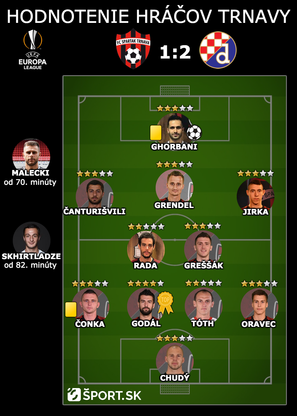 Vachtang ČANTURIŠVILI (ľavý záložník) 3/5 Patril medzi najaktívnejších hráčov na ihrisku. Zápas ho zastihol v dobrej forme, podnikal nebezpečné výpady. Napriek ofenzívnej aktivite sa výborne vracal aj do defenzívy po strate lopty.