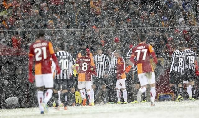V Istanbule nepriaznivé počasie spôsobilo organizátorom problémy už pred úvodným výkopom dôležitého duelu Galatasarayom s Juventusom. Po odprataní snehu z hracej plochy a jej okolia sa zápas napokon začal. Bielu loptu vymenil rozhodca Proenca za oranžovú, no tá sa postupom času v snehu strácala hráčom z dohľadu. Situácia sa vyhrotila v 32. minúte, keď hlavný arbiter prerušil zápas a hráči sa pobrali späť do šantí. Celé ihrisko pokryl sneh za sedem minút. Po uplynutí dvadsaťminútovej čakacej doby padlo rozhodnutie, že diváci výsledok v utorok nespoznajú. Zápas dohrajú od 32. minúty v stredu alebo v termíne, ktorý stanoví UEFA.