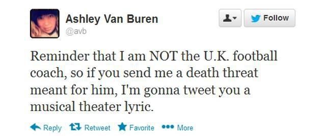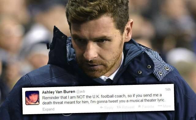 Na strane rodáka z Porta neboli požadované výsledky a ani fanúšikovia. V nedeľu naporcoval kohúta na White Hart Lane FC Liverpool (0:5) a priaznivci Spurs 36-ročného kormidelníka dokonca posielali na druhý svet. Pochopiteľne výhražnými správami na sociálnej sieti. Je tu však jeden háčik, a poriadne zásadný. Správy totiž nechodili jemu, ale úplne inej osobe! Na známej sociálnej sieti Twitter je totiž istá Ashley Van Burenová z New Yorku, ktorej konto má názov „@avb“. A ako znie zavedená prezývka Villasa-Boasa v Anglicku? „AVB“. Vzhľadom na to, že Twitter je na západe veľmi rozšírený, tak Ashley si na svojom konte mohla vychutnať poriadne množstvo nemilých, krutých a vulgárnych odkazov. „Nechceme ťa v našom klube. Umri!“, „Teraz je ten čas, že tento potkan @avb si pobalí kufre a zmizne do p...“, „Nemôžem sa dočkať toho, kedy ťa vyhodia na ulicu ako hov..., ktorým si!“, „Si obyčajný s... syn, dúfam, že zomrieš“, objavovalo sa na konte nevinnej Newyorčanky, ktorá celú situácia napokon zvládla bravúrne a najmä s chladnou hlavou.Na poniektoré odkazy reagovala metaforami, textom z piesni, či newyorských muzikálov. Napríklad: „Nebojte sa, slnko znovu vyjde na druhý deň“, alebo na otázku, ako vysvetlí výkon tímu v zápase proti Liverpoolu, odpovedala: „Diaľnicou života rútime sa bez náznaku ľútosti“. Či na výzvu: „Mal by si ísť radšej do kostola“ reagovala: „...ale ja sa dnes nejdem vydávať.“