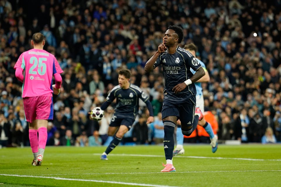 Futbalisti Realu Madrid si postrážili náskok 3:0 z prvého zápasu a po víťazstve 2:1 na pôde Manchestru City postúpili do štvrťfinále Ligy majstrov. Domáci hrali od 20. minúty bez Bernarda Silvu, ktorý pred bránkovou čiarou zahral rukou a videl červenú kartu. Nariadenú penaltu premenil Vinícius, ktorý strelil aj druhý gól hostí.