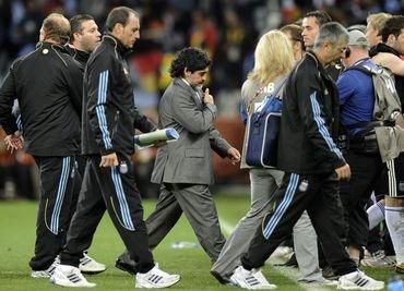 Po debakli zostala krajina v šoku a niektorí z fanúšikov smerovali svoj hnev na trénera národného tímu Diega Maradonu . Ten prežíva podľa vlastných slov jedno z najsmutnejších období v živote a uvažuje o svojej rezignácii. Ohlasy médii: Španielsko v raji, argentínsky kat Klose>> VIDEO Maradona: „Možno odídem už zajtra">> Juhoameričania utrpeli najhoršie pokorenie na svetovom šampionáte od roku 1974, keď s Holandskom prehrali tiež 0:4. Štyridsaťdeväťročný jeden z najlepších hráčov histórie futbalu upadol po ťažkej štvorgólovej nádielke do neskrývaného smútku. "Podobne som sa cítil aj v deň, keď som prestal hrať futbal. Táto bolesť je naozaj silná," skonštatoval bývalý tvorca hry, ktorý kariéru ukončil na svoje 37. narodeniny v roku 1997, a pokračoval: "Je to príliš veľké sústo. Naším cieľom bolo dostať sa cez Nemecko a byť medzi štyrmi najlepšími mužstvami na svete. To sme však nedokázali. Všetci sme o tom snívali a dúfali v postup. Opak sa však stal skutočnosťou."