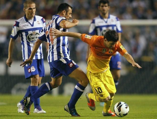 Argentínčan v ôsmich súbojoch La Ligy v ročníku 2012/13 dal už 11 gólov, o dva viac ako Cristiano Ronaldo z Realu Madrid. Po zápase v La Coruni sa ponáhľal Messi do nemocnice. "Chce stihnúť pôrod potomka. Jeho syn by sa mal už čoskoro narodiť," vysvetľoval športový riaditeľ Barcelony Andoni Zubizarreta.Barcelona na štadióne Riazor viedla v 18. min už 3:0. Najskôr Jordi Alba v 3. min zužitkoval prihrávku od Cesca Fábregasa, potom sa presadil Cristian Tello a potom dosiahol prvý presný zásah po ďalšej Fábregasovej akcii Messi. Domáci vďaka úspešnému pokutovému kopu Pizziho a gólu Alexa Bergantinosa znížili na 2:3, ale Messi po ďalšej asistencii od Fábregasa svoj tím upokojil a do šatní ho poslal s vedením 4:2. Deportivo malo výborný úvod druhého polčasu, v 47. min sa presadil opäť Pizzi. Následne uvidel Mascherano červenú kartu. Tréner Barcelony Tito Vilanova zareagoval na oslabenia striedaním, namiesto Fábregasa poslal na ihrisko Xaviho. V 77. min Argentínčan skompletizoval hetrik, ale o dva góly si strelil bizarný vlastný gól Jordi Alba. Deportivo dostalo šancu bojovať aspoň o bod a do konca duelu bolo všetko otvorené.