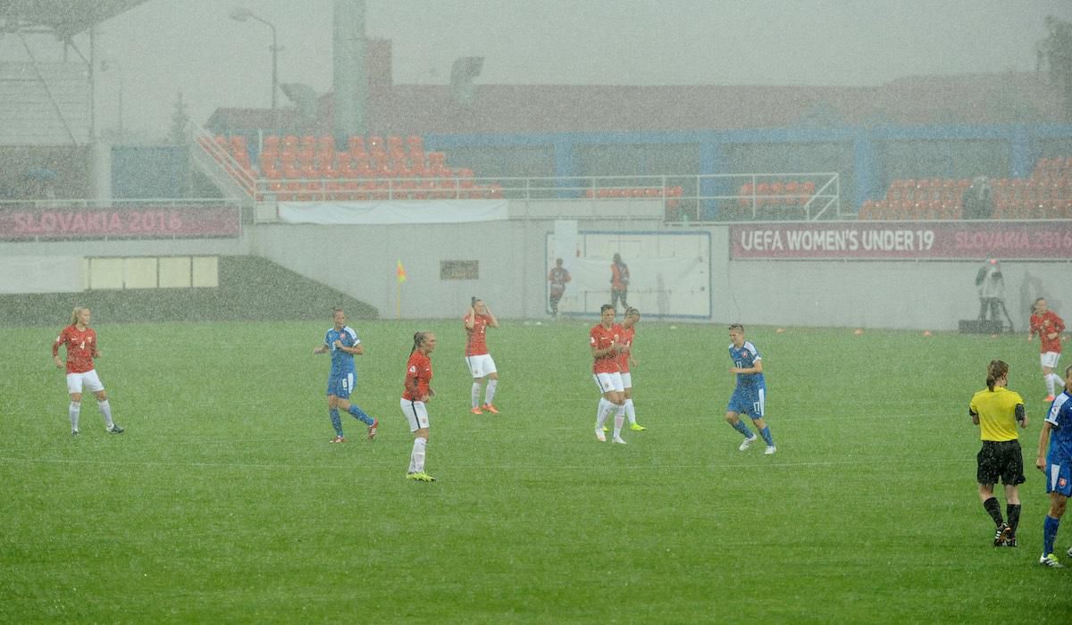 V čase začiatku zápasu totiž na štadióne Národného tréningového centra v Senci vládlo slnečné počasie. Veľkej horúčave sa prispôsobili obidva tímy a stretnutie začali opatrne a vo vlažnejšom tempe. Napriek tomu sa už v 3. minúte otriaslo brvno francúzskej brány po strele Bonmati. Francúzky odpovedali v 14. min, keď z priameho kopu mierila kapitánka Greboval tesne nad. V 22. min zápasu začalo na seneckom štadióne pršať, pričom hustý a vytrvalý dážď poznačil kvalitu a históriu finále.
