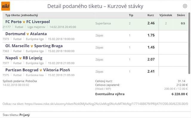 Päticu duelov z európskych pohárových súťaží si na svoj tiket vybral tipujúci v Bratislave. Jeden duel sa už skončil podľa želaného konca. Potrebuje ešte ďalšie štyri zápasy. Ak vo vybranom štvorlístku uspejú domáce kolektívy, na jeho konto pribudne viac než 6-tisíc eur. Bude sláviť úspech?