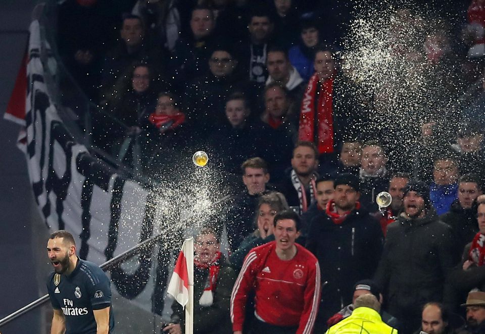 Počas víťazného odvetného osemfinálového duelu Ligy majstrov na pôde Realu Madrid (4:1) priaznivci Ajaxu hádzali na ihrisko rôzne predmety a spôsobili tým škody.