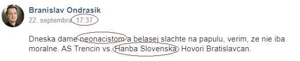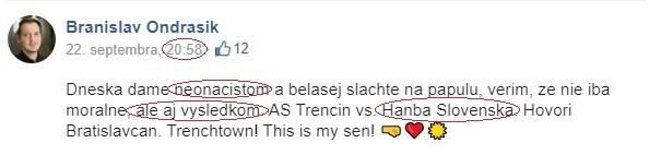 Zároveň verejne urazil klub ŠK Slovan Bratislava, ktorý označil synonymom „Hanba Slovenska“. Z príspevku je jasné, že v tento deň hral AS Trenčín zápas iba proti nášmu klubu a teda urážka na náš klub je jasná.