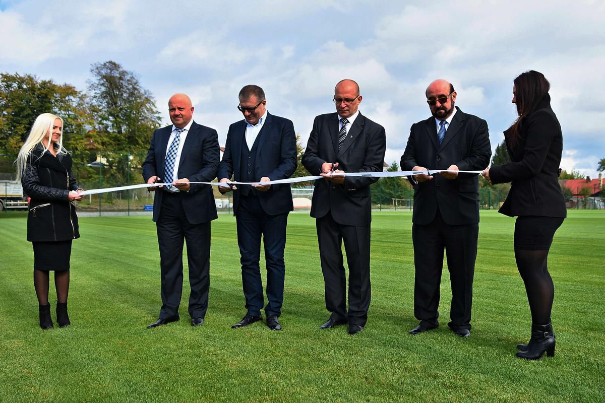 Foto: Zľava prezident FK Poprad Roman Dvorčák, prezident SFZ Ján Kováčik, primátor Popradu Jozef Švagerko a spolumajiteľ Aquacity Poprad Ján Telenský strihajú pásku počas otvorenia nového tréningového futbalového ihriska vybudovaného pri NTC SFZ v Poprade