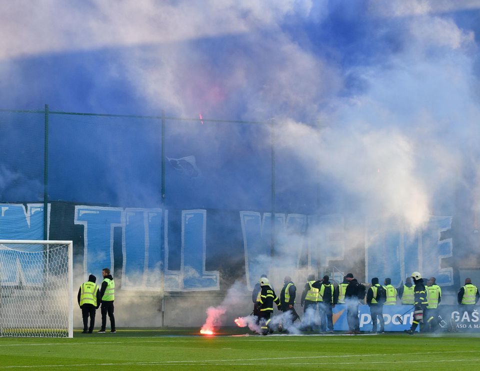 Šláger 11. kola Fortuna ligy hlavný rozhodca Filip Glova predčasne ukončil po dlhej prestávke, ktorú spôsobili výtržnosti priaznivcov oboch tímov.
