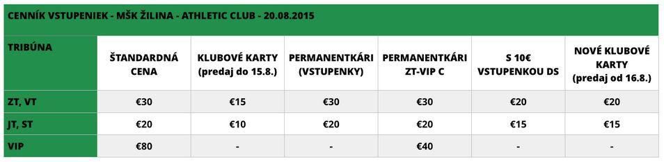 Vedenie MŠK Žilina zverejnilo ceny vstupeniek na domáce stretnutie play-off Európskej ligy UEFA proti španielskemu Athletic Club Bilbao. Cenová relácia sa pohybuje v rozmedzí 10 až 80 eur.