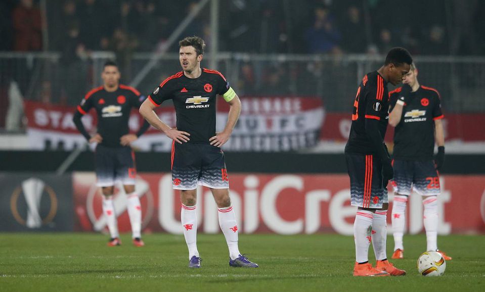 Manchester United si nezahojil rany po kolísavých výkonoch v Premier League ani vo vyraďovacej fáze 16-finále Európskej ligy. Bez kapitána Wayna Rooneyho i španielskeho brankára Davida de Geu, ktorý sa zranil na predzápasovej rozcvičke, prehral tím Louisa van Gaala s dánskym Midtjyllandom na jeho pôde 1:2.