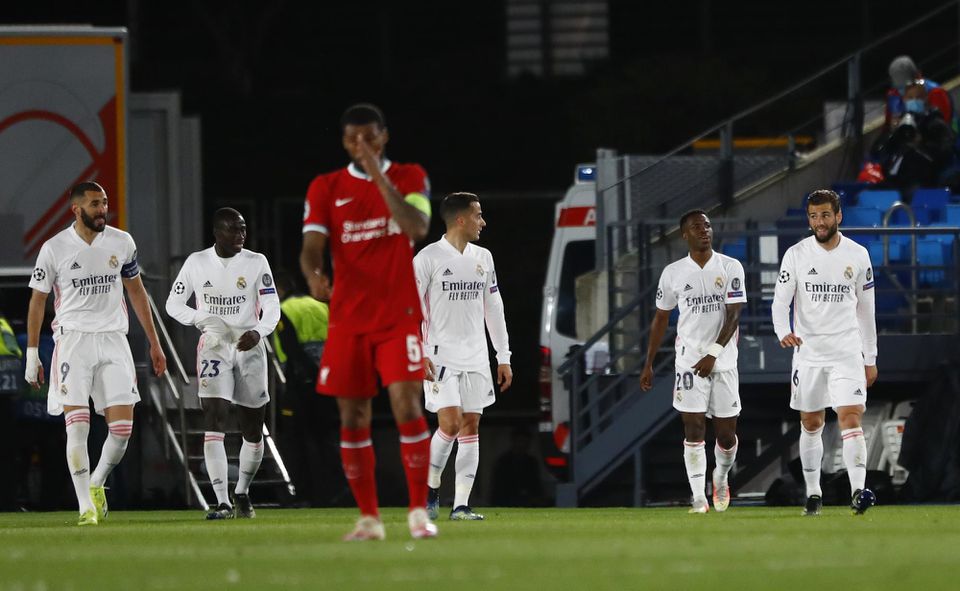 Rekordný 13-násobný víťaz súťaže Real Madrid si už v prvom polčase vypracoval dvojgólový náskok, Liverpool nemal v tom čase na konte žiadny strelecký pokus. Domáci sa museli zaobísť bez zraneného kapitána Sergia Ramosa, ich snaha v úvodnej desaťminútovke priniesla iba dva rohové kopy bez výraznejšieho ohrozenia bránky súpera. To prišlo až v 14. minúte, keď Ferlan Mendy na ľavej strane obišiel protihráča a po jeho centri hlavičkoval Vinicius Junior vedľa bránky. Ten istý hráč sa v 27. minúte už dočkal, keď si na hrudi spracoval skvelý pase Toniho Kroosa hlboko z vlastnej polovice a proti jeho zakončeniu bol Allison bezmocný. O deväť minút neskôr viedol Real o dva góly, pretože ďalší ďalekonosný pas Kroosa odvrátil Trent Alexander-Arnold iba pred Marca Asensia, ktorý si obhodil brankára a pohodlne pridal druhý zásah svojho tímu. Pred prestávkou ešte mohol zvýšiť opäť Asensio, z uhla však netrafil do priestoru bránky.