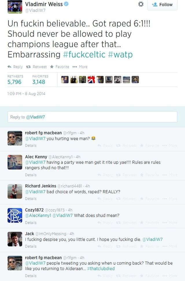 Un fuckin believable.. Got raped 6:1!!! Should never be allowed to play champions league after that.. Embarrassing #fuckceltic#watp — Vladimir Weiss (@VladiW7) August 8, 2014