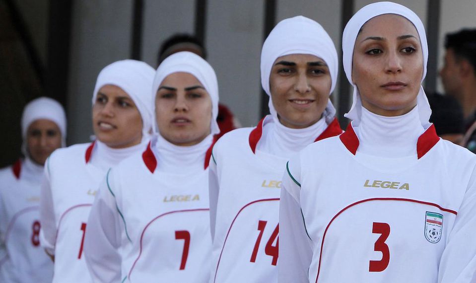 Iránske ženy hrajú futbal zahalené v šatkách hidžáb. Oblečené sú v dresoch s dlhými rukávmi na rukách i nohách, čo sťažuje identifikáciu pohlavia.