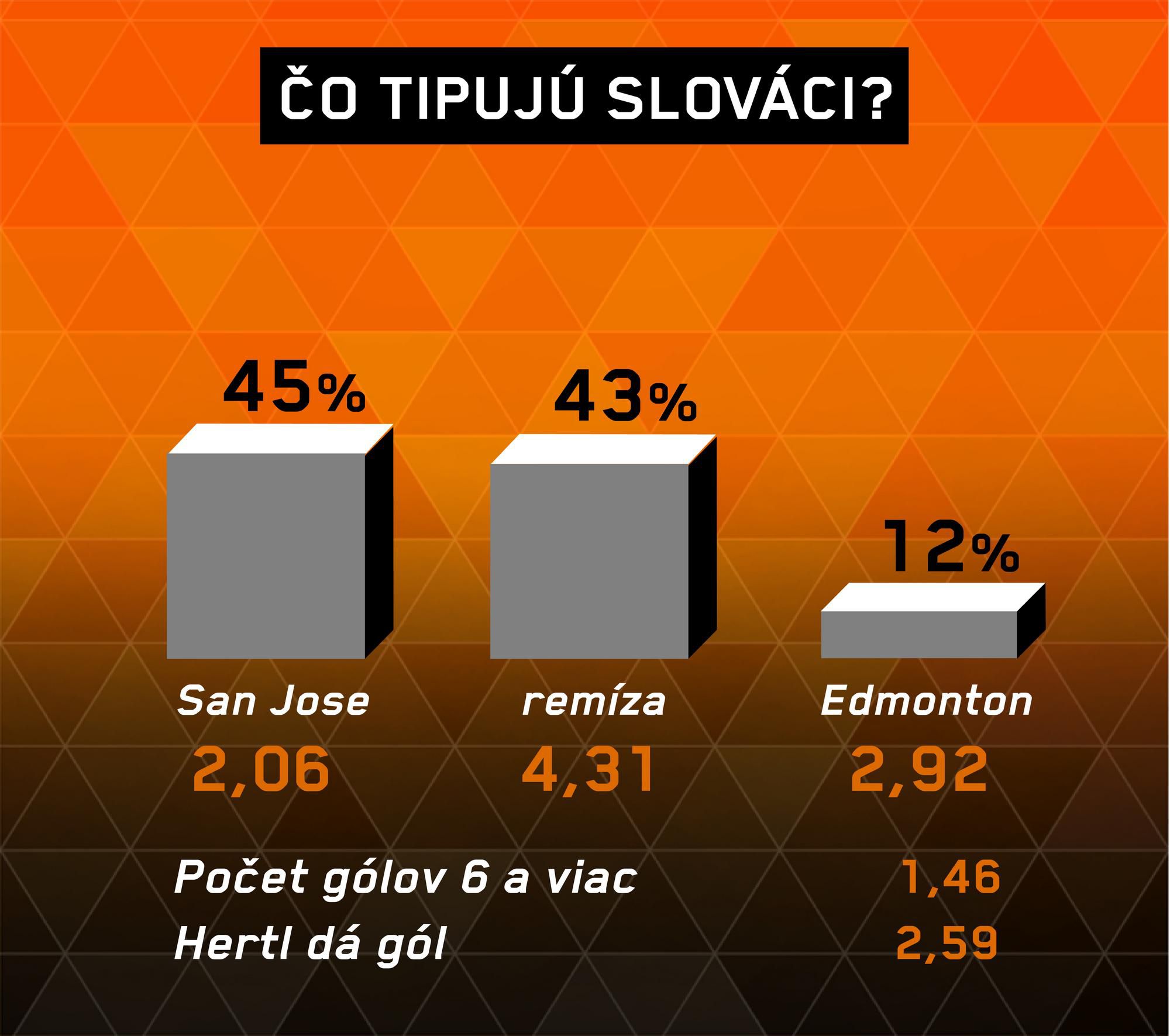 Papierové predpoklady mierne favorizujú domácich. San Jose má formu a s Edmontonom priaznivú bilanciu. Volíme jednotku, z odvodených stávok vyšší počet gólov a z hráčov Tomáša Hertla, ktorý sa dostal do streleckej formy.