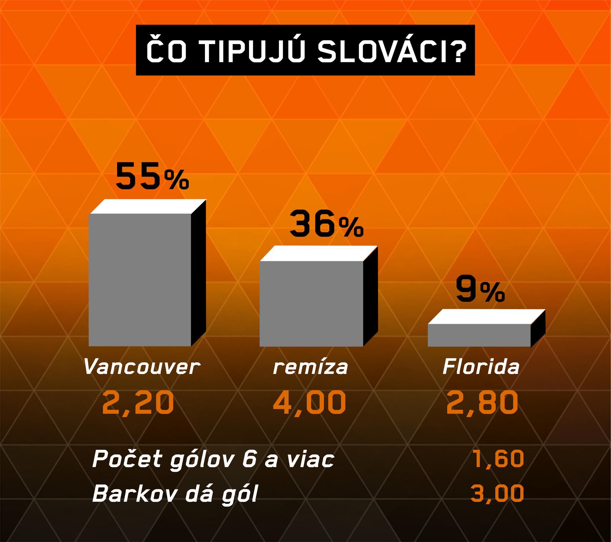 Tento súboj by mohol priniesť väčší počet gólov ako 5,5, pričom výsledky, forma i domáce prostredie hovoria veľmi mierne v prospech Vancouvru. Pri vyrovnanosti zápasov Floridy však volíme istejší tip na víťaza zápasu.