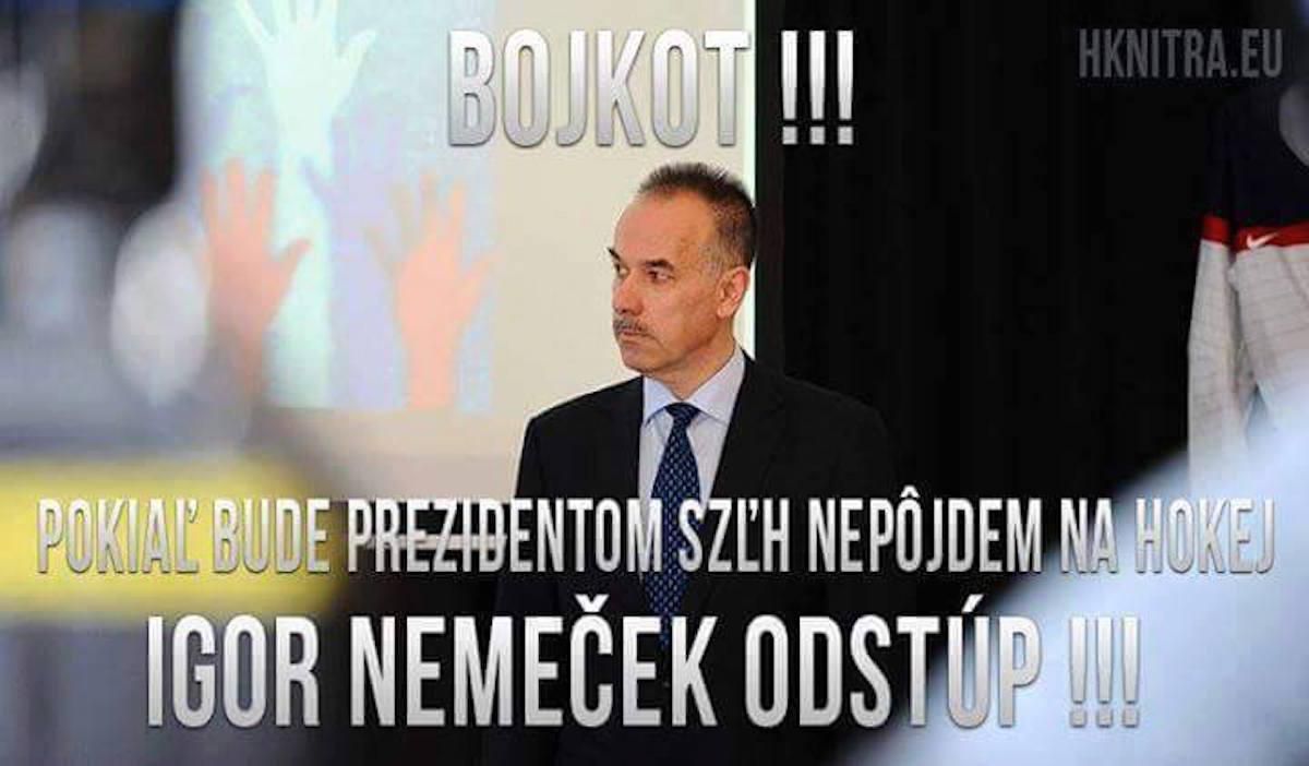 „Vyzývame všetkých fanúšikov na bojkot zápasov 1. kola hokejovej Tipsport Extraligy, aby na protest proti zvoleniu Igora Nemečka do funkcie prezidenta SZĽH vyjadrili svoju podporu protikandidátovi Richardovi Lintnerovi. Protest bude trvať až do chvíle, kedy sa pán Nemeček nevzdá postu prezidenta SZĽH, t.j. aj po prípadné 2.,3. či 4. kolo hokejovej Extraligy.“