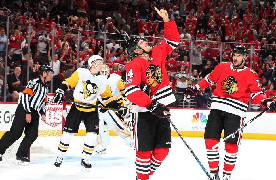 Góly: 7. Hartman (P. Kane, Kempný), 8. Saad (PÁNIK), 9. Schmalz (P. Kane, Hartman), 10. Saad (Seabrook, Keith), 18. Sharp (Anisimov), 24. P. Kane (Hartman, Forsling), 30. PÁNIK (Schmalz, Rutta), 31. Schmalz (P. Kane, Hartman), 46. Saad (Toews, Seabrook), 54. Seabrook (Hayden, Hartman) - 23. Kessel (Crosby, Malkin)