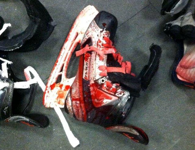 Videozáznam z nešťastného incidentu tentokrát nie je k dispozícii. Jediné, čo máme, je fotka krvavej Wellwoodovej korčule, z ktorej behá mráz po chrbte.