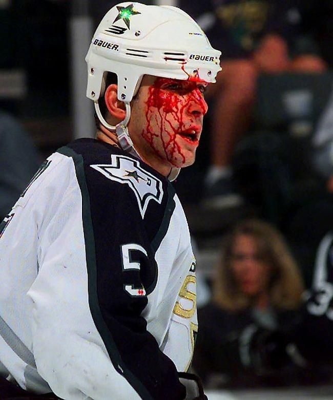 Takto vyzeral obranca Dallasu Stars v roku 1997, keď sa v zápase proti New Yorku Rangers zrazil s mantinelom. Ďalší tvrdý chlapík na korčuliach. Je ako vystrihnutý z hororu.