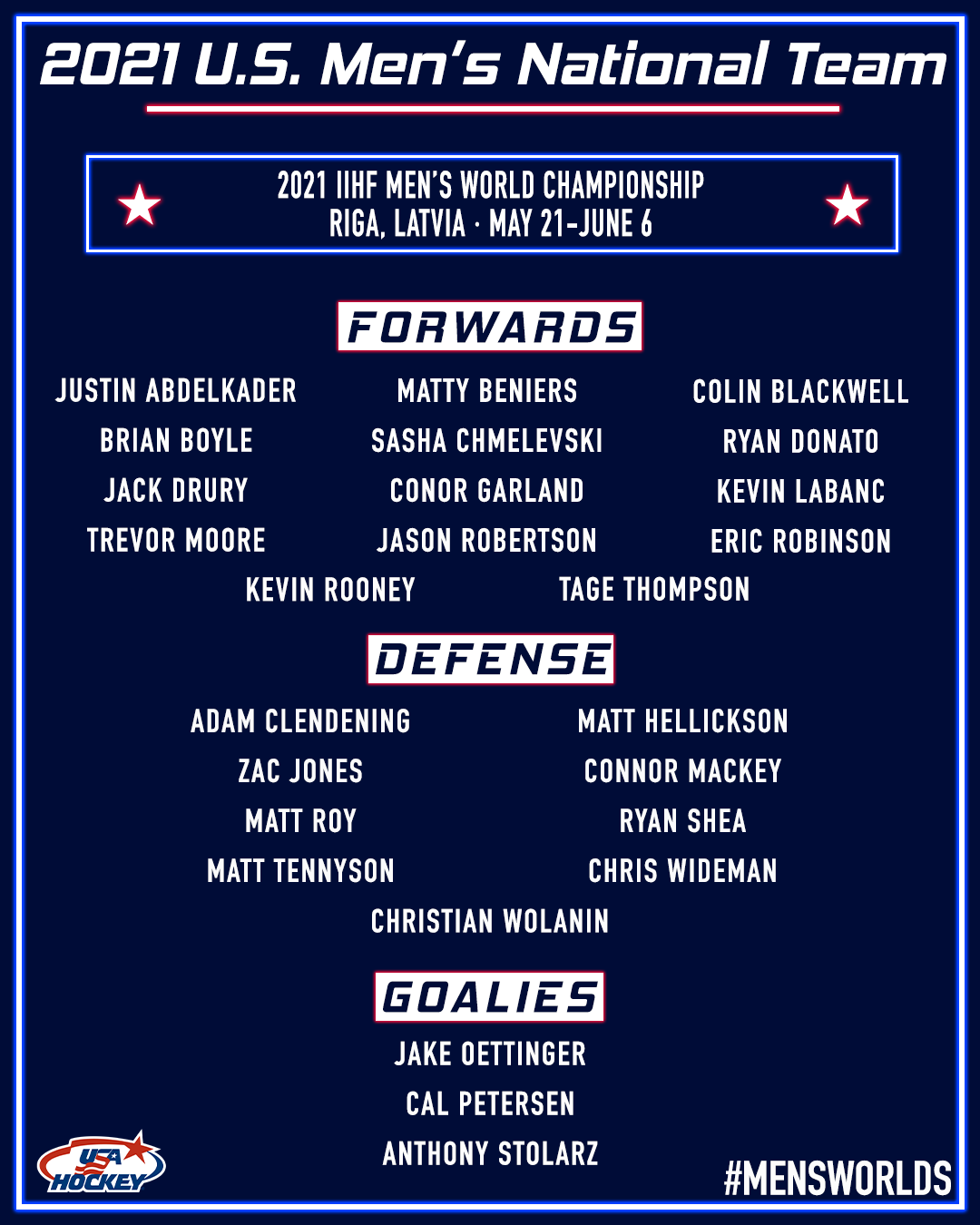 Hokejová reprezentácia USA zverejnila záverečnú nomináciu na majstrovstvá sveta v hokeji 2021, ktoré sa budú konať v lotyšskej Rige.