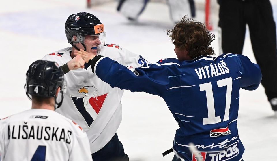 Úvodná tretina bola z pohľadu hokejovosti doteraz najlepšou v celej sérii. Skóre sa menilo až štyrikrát v priebehu piatich minút. Nitrania viedli zásluhou Slováka a Fominycha 1:0, respektíve 2:1, ale Matoušek a Maier na opačnej strane dokázali potrestať nedôraz v obrannom pásme Nitry. V prvej dvadsaťminútovke zaujala ešte pästná výmena Vitáloša s Kundrikom, v ktorej mal jasne navrch obranca domácich.