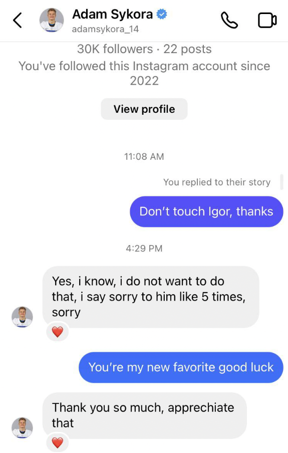 Za všetko hovorí príhoda z kempu New Yorku Rangers. Adam Sýkora išiel aj na tréningu naplno, tak ako je to u neho zvykom. V jednej situácii však narazil do hviezdneho brankára Igora Šesťorkina.