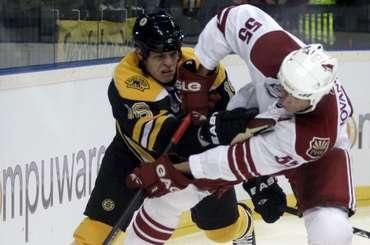Hráči Bostonu na čele so svojím kapitánom Zdenom Chárom, ktorý pred duelom predĺžil zmluvu s klubom o ďalších sedem rokov, sa síce snažili, ale nedokázali sa dlho presadiť cez pozornú obranu Coyotes. Phoenix bol navyše efektívny a trestal chyby Bruins. Po dvoch tretinách viedol 4:0 a zdalo sa byť rozhodnuté. V záverečnej časti hry sa však dvakrát presadil Nathan Horton z Bostonu a zdramatizoval koncovku. Phoenix však náskok udržal, Radim Vrbata svojim druhým gólom v zápase do prázdnej bránky ho navyše ešte zvýraznil. Zdeno Chára si v zápase pripísal premiérový kanadský bod v novej sezóne za asistenciu. Oba tímy sa stretnú v Prahe aj v nedeľu od 16.00 h.Výsledok :