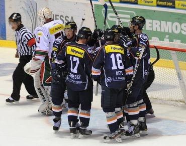 Zostavy: Košice: Hylák - Michal Novák, Deyl, J. Tabaček, Homer, M. Grman, Šeda, M. Biro - P. Bartoš, Zálešák, P. Fabuš - Pašek, Vorel, M. Miklík - Jenčík, E. Piatak, Dravecký - Matúš Chovan, Mlynarovič, Marcel HaščákSkalica: Tomek - Vyrubalík, Šmach, Kloz, I. Jankovič, Gula, Bučka, Jaborník, Magušin - Pálffy, R. Školiak, J. Hruška - Lušňák, T. Mikúš, T. Višňovský - Kutálek, Holovič, Šátek - Klejna, Jurík, R. Konečný V košickej Steel aréne začali aktívnejšie domáci a svoj tlak pretavili vo vedúci gól v 9. minúte. Jenčík si nakorčuľoval spoza bránky pred Tomeka a z tesnej blízkosti pomedzi betóny skóroval - 1:0. Skaličania však odpovedali takmer okamžite, keď sa v početnej výhode o jedného muža presadil Hruška, ktorý zužitkoval ideálnu prihrávku a vyrovnal - 1:1. V nasledujúcom priebehu sa hra vyrovnala a šance sa striedali na oboch stranách. V 16. minúte mohol poslať hostí do vedenia Školiak, ale v úniku nedokázal prekonať Hyláka. O dve minúty neskôr sa na opačnej strane rútil na Tomeka Haščák, no jeho strela našla iba vyrážačku brankára. V závere úvodnej dvadsaťminútovky sa predsa len skóre zmenilo po Piatakovej strele sa k puku dostal Dravecký a nekompromisne skóroval - 2:1. O tretí gól "oceliarov" sa v 23. minúte opäť postaral tretí košický útok, potom ako Grman našiel časovanou prihrávkou Piataka a ten poslal puk k pravej žrdi Tomekovej bránky - 3:1. Záhoráci mohli znížiť v 28. minúte, keď sa dostal na modrej čiare k puku Pálffy, avšak sám zoči-voči domácemu gólmanovi nepochodil. Napriek tejto príležitosti mali aktivitu na svojich hokejkách domáci, ktorú korunovali v 38. minúte. Bartoš sa po ideálnej prihrávke ocitol v úniku a zvýšil na 4:1. Vzápätí okorenil košické snaženie piatym gólom Chovan, ktorý zužitkoval Pašekovu prihrávku do priestoru. V záverečnom dejstve sa Skaličania snažili znížiť nepriaznivý stav, ale ich útoky stroskotávali na dobre organizovanej košickej defenzíve. V 49. minúte navyše inkasovali po delovke obrancu Nováka, ktorý napriahol od modrej čiary po priťuknutí od Fabuša - 6:1. Košičania s prehľadom kontrolovali hru a zápas doviedli do úspešného konca.