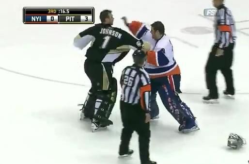 Brankár domácich Brent Johnson pri svojom treťom štarte v sezóne zastavil všetkých 20 striel "ostrovanov", zaznamenal shoutout a k tomu všetkému si to na ľade "rozdal" aj s gólmanom "Islanders" Rickom Di Pietrom. Johnson v následnom pästnom súboji knokautoval Di Pietra jediným úderom. Brankár, ktorý sa doteraz nikdy v NHL nebil sa vyjadril k bitke nasledovne: "Išlo o moju prvú bitku v NHL. V nižších súťažiach som sa už niekoľkokrát pobil," povedal Johnson. Obaja brankári po šarvátke museli opustiť hraciu plochu. V bráne "Penguins" zápas dohral Marc-Andre Fleury, ktorý už neinkasoval."Johnny mal šialený výraz. Je pravák, no v súboji sa bil ľavou rukou. Bolo to úžasné. Bol úplne v kľude. Z ničoho nič udrel a bolo to tam," komentoval výkon Johnsona ďalší gólman "Penguins" Marc-Andre Fleury. "Bola to bitka, táke veci sa stávajú. Mal však dlhšie ruky," nechal sa počuť gólman "Islanders" Rick Di Pietro.