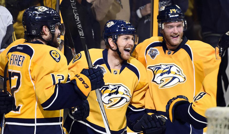 Góly: 1. Wilson (Ekholm, Ellis), 10. Fisher (Neal, Josi), 56. Neal (Ellis, Wilson), 112. Fisher (Ekholm, Wilson) – 4. Burns (Couture, Martin), 35. Donskoi (Vlasic, Martin), 47. Burns (Couture, Thornton). Brankári: Rinne - Jones, strely na bránku: 45:47, 17.188 divákov