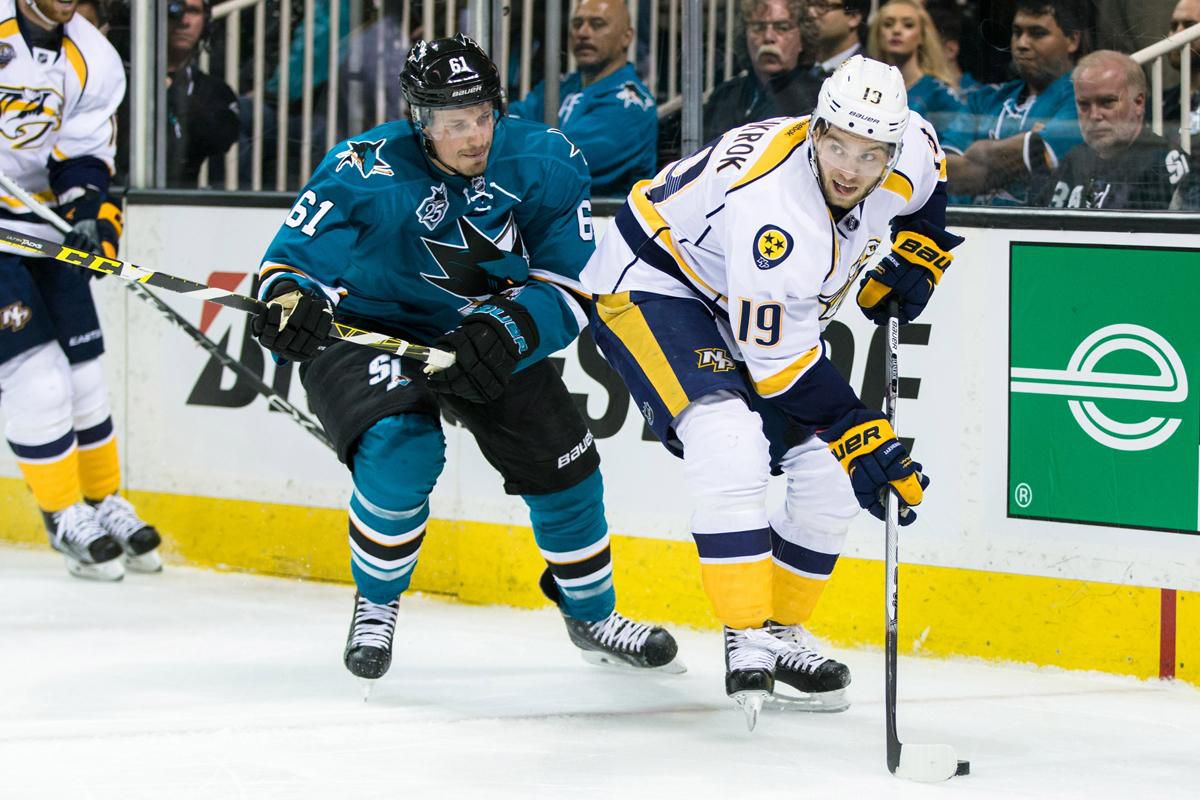 Nashville viedol v San Jose po dvoch tretinách gólom Mikea Fishera 1:0, ale "žraloci" v tretej časti predviedli parádny obrat a vyhrali 5:2. Sharks naštartoval v 43. minúte presilovkový gól Tomáša Hertla, ktorý našiel miesto pod lapačkou Pekku Rinneho a vyrovnal na 1:1. O necelých desať minút neskôr už Sharks viedli, keď si strelecký účet v play off otvoril bývalý hráč Predators Joel Ward, ktorý po blafáku krásne zasunul puk za chrbát fínskeho brankára.