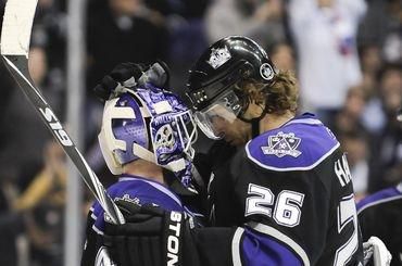 Góly : 5. HANDZUŠ (Jack Johnson, Martinez), 39. Smyth (Justin Williams), 53. Smyth (Jack Johnson, Kopitar) - 19. MARIÁN HOSSA (KOPECKÝ , P. Sharp), 28. P. Sharp (P. Kane, Toews), 45. P. Sharp (KOPECKÝ ), 55. Toews.Vylúčení : 4:5 na 2 min, presilovky : 1:2, oslabenia : 0:0. Strely na bránku : 29:28, brankári : J. Quick - C. Crawford. Diváci : 17 916.