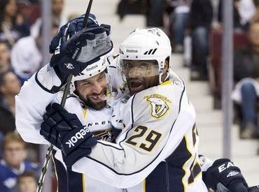 Možnosť uzavretia vyraďovacej série Vancouveru doma nevyšla. "Canucks" totiž podľahli na domácom ľade Nashvillu 3:4."Predators" tak upravili stav série na 3:2. Na výhre hostí mali najväčšiu zásluhu pravý krídelník Joel Ward (2+1), center David Legwand (2+0) a brankár Pekka Rinne (31 úspešných zákrokov z 34 striel). Gólman Pekka Rinne chválil svojho spoluhráča a prvú hviezdu večera Warda nasledovne: "V tejto sérii je skvelý. Je v nej určite našim najlepším hráčom. Tvrdo na sebe makal. Je to skvelý tímový hráč a typický hráč "Predators". Bol odmenený za hru, proti ťažkým 'chlapíkom'." "Naša hra sa zlepšila. Myslím, že ako tím sme hrali dobre. Súper nemal veľa šancí, no tie, ktoré sa mu naskytli, boli tutovky...Ak to vylepšíme, budeme v pohode," nechal sa počuť Daniel Sedin (Vancouver), ktorý v štatistikách +/- získal bilanciu -4 a v kombinácii s bratom Henrikom Sedinom -7. V bráne domácich odchytal celý zápas Roberto Luongo (19 úspešných zákrokov z 23 striel). Kompletný výsledkový a tabuľkový servis NHL nájdete TU>> Výsledky: