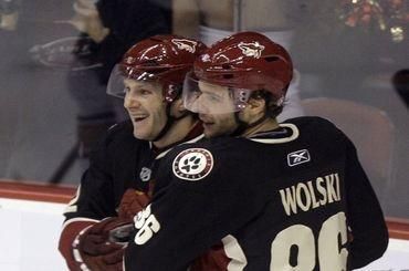 Góly : 1. Hanzal (Ray Whitney, Schlemko), 22. Wolski (Stempniak, Ekman-Larsson), 38. Stempniak (E. Belanger, Schlemko), 54. Hanzal (Morris, Doan), 60. Stempniak (E. Belanger, Wolski). Vylúčení : 2:2, presilovky : 1:0, oslabenia : 0:0. Strely na bránku : 34:23, brankári : Bryzgalov - Dubnyk. Diváci : 9354.