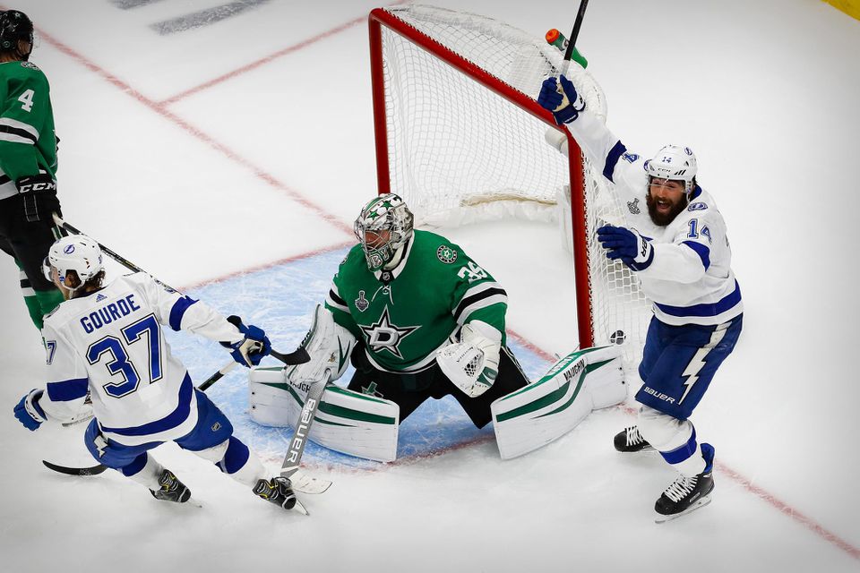 Góly: 8. Klingberg, 19. Pavelski (Benn, Radulov), 29. Perry (Seguin, Janmark), 52. Pavelski (Seguin, Heiskanen) - 20. Point (Palát, Shattenkirk), 23. Point (Killorn, Kučerov), 39. Gourde (Kučerov, Sergačov), 47. Killorn (Sergačov, Cirelli), 67. Shattenkirk (Hedman, Maroon). Rozhodovali: Sutherland, Charron - Kovachik, Barton, vylúčení: 5:4 na 2 min, presilovky 0:3, oslabenia: 0:0, strely na bránku: 30:35, bez divákov.