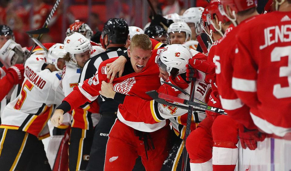 Všetko sa to začalo necelých šesť minút pred koncom, kedy už bolo o výsledku rozhodnuté. Za stavu 6:2 pre Detroit sa do seba pustili útočník Detroitu Luke Witkowski a obranca Calgary Brett Kulak .
