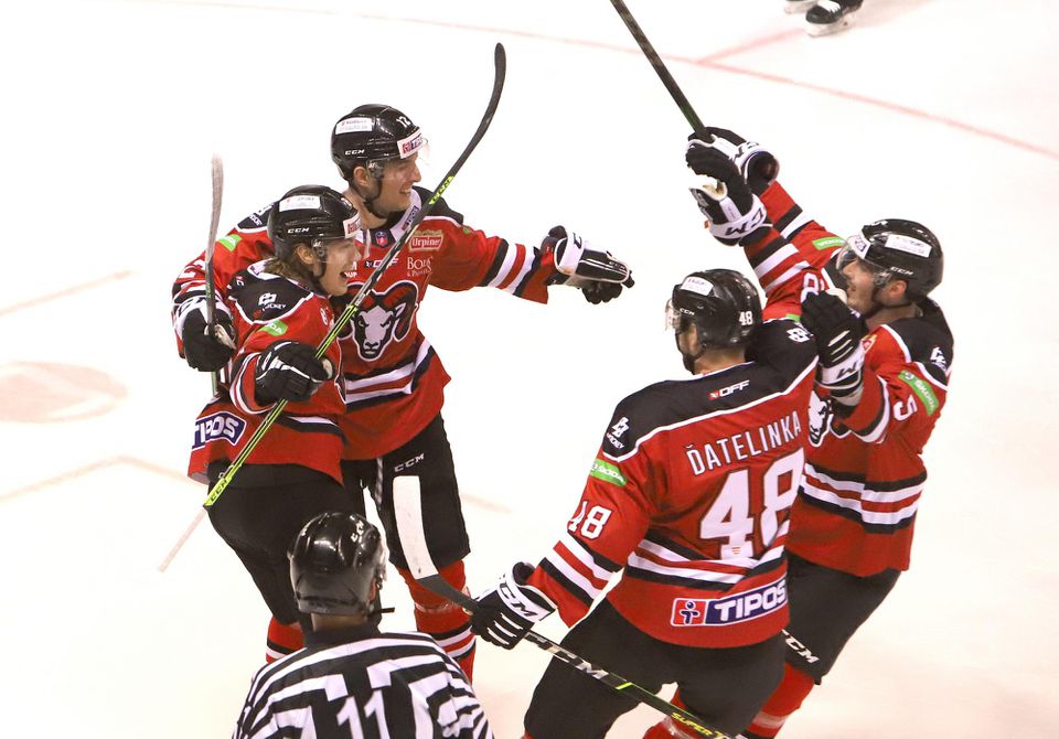 Líder ligy vyrovnal v 29. min, keď sa do rýchleho protiútoku dostal Marcinek, tiesnený obrancom urobil obrat o 360 stupňov a naservíroval puk priamo pred bránu voľnému Leskinenovi. Bystričania sa opäť dostali do vedenia zásluhou švihu Bergera v 44. min, hráči spod Pustého hradu však znovu dokázali vyrovnať. V 53. min Leskinen prestrelil húštinu hráčov a skompletizoval hetrik. Súboj museli rozhodnúť nájazdy. Domáca trojica sa nepomýlila, hostia nedali ani jeden.