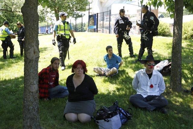 Hovorkyňa miestneho policajného zboru Anie Lemieux informovala, že príslušníci polície zatkli približne 30 ľudí na zastávke metra neďaleko pretekárskeho okruhu. Niektorí demonštranti sa pokúšali zaplniť stanice podzemných vlakov, aby sa priaznivci motorizmu nemohli dostať na okruh a sledovať preteky, no policajti vykonávali prísne kontroly ľudí s batohmi a znakom červeného štvorca. Tento symbol používajú demonštranti z radov študentov. Polícia nebrala ohľad ani na deti s malými ruksakmi...