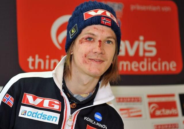 Zranený nórsky skokan na lyžiach Tom Hilde počas tlačovej konferencie v dejisku pretekov Turné štyroch mostíkov v nemeckom Garmisch-Partenkirchene. Hilde utrpel pri nešťastnom piatkovom páde v úvodných pretekoch turné zlomeninu ôsmeho stavca a sezóna pre neho predčasne skončila. Severský skokan by však našťastie nemal mať poškodený nervový systém.