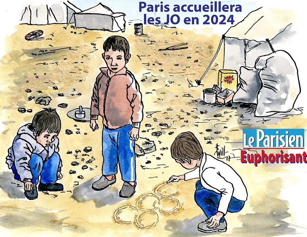 Odkaz na titulku periodika Le Parisien, ktorá vyšla s veľkým titulkom "LE PARISIEN EUFORICKÝ" znázorňuje deti z chudobných pomerov, ako sa tešia z konania Olympijských hier.