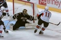 Andrew Raycroft saves the day. Takto by to povedali v zámorí, doslova to znamená Andrew Raycroft zachránil deň. A je to pravda. Brankárska dvojka Dallasu vytiahla úžasný zákrok na kapitána Ottawy Alfredssona presne sekundu pred koncom zápasu za stavu 3:2.